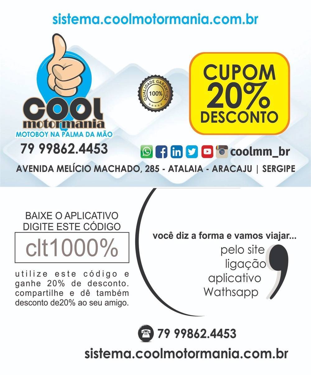 Com o número para chamadas por ligação ou Wathsapp: (79) 99862.4453 ou via aplicativo cliente (versão para Android): Baixar aplicativo 100% seguro. Na versão do cliente, é exibido o valor fixo da viagem. Que deve ser igual ao apresentado pelo motoboy em viagem. Temos grandes diferenciais. Tais como o cliente visualizar a viagem em tempo real. Por onde o seu motoboy está vindo e à uanto tempo de distância ele está do cliente que solicitou a viagem. Com os demais detalhes estão inclusos o detalhe como a forma de pagamento escolhida pelo cliente, um chat para conversa com o motoboy ou vice versa, botão para chamadas emergenciais direcionadas por um botão dentro do aplicativo. E um grande detalhe é que ao final de todas as corridas o cliente avalia como foi atendido pelo motoboy. Dando a ele 5 estrelas ou menos. Sendo assim, o que não manter o padrão de alta qualidade logo perderá seu cadastro ou a permissão de atuar pelo aplicativo. Buscamos uma forma de nossos clientes ficarem 100% satisfeitos. Deixamos aqui também o e-mail do atendimento@coolmotormania.com.br, para tratarmos todos os tipos de problemas caso venham a existir. Também para receber sugestões e reclamações dos nossos clientes.